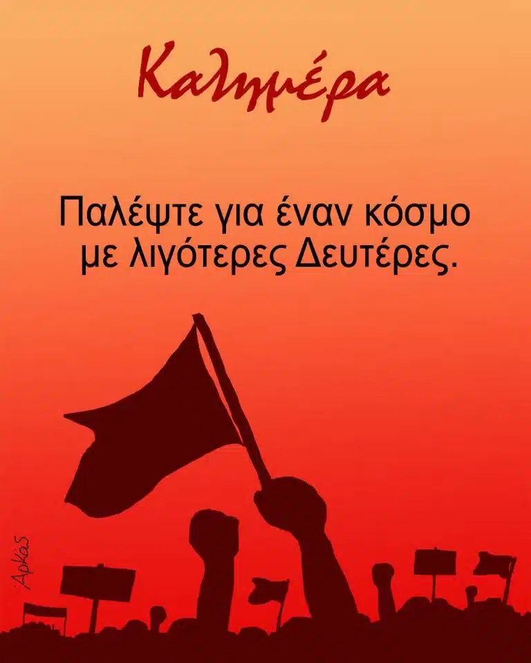 Ο Αρκάς με το σημερινό του σκίτσο μας λέει όπως συνηθίζει κάθε πρωί καλημέρα. Έχει εμπνευστεί από τις διαδηλώσεις που μας απασχολούν το τελευταίο διάστημα λόγω του πολέμου και μεταφέρει τον επαναστατικό αυτόν χαρακτήρα και στην πιο δύσκολη μέρα της εβδομάδας που δεν είναι άλλη από τη Δευτέρα ή τσαγκαροδευτέρα.