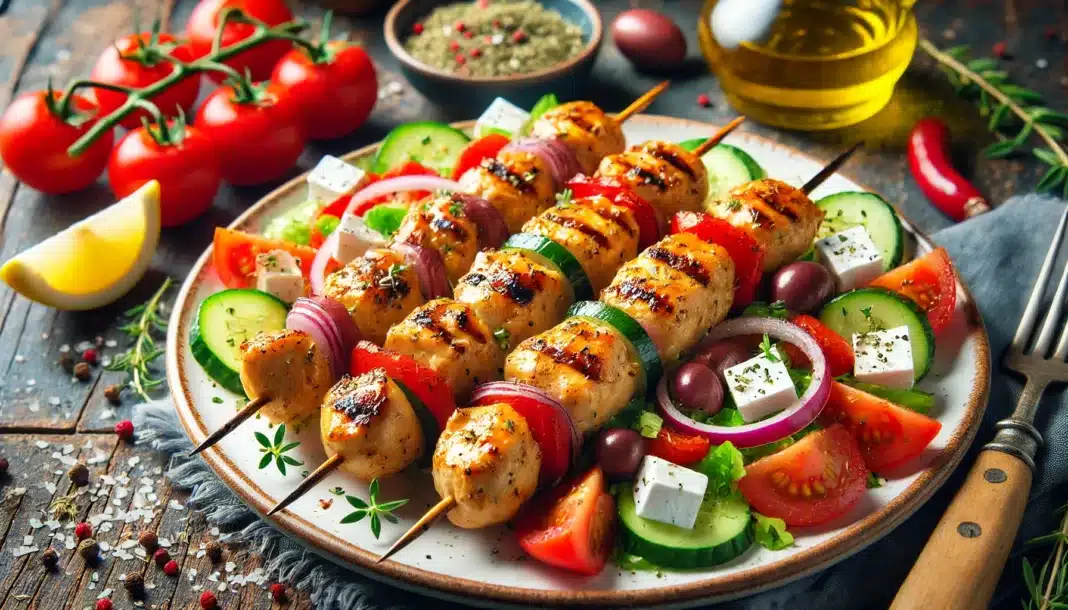 Τα σουβλάκια κοτόπουλο με σαλάτα χωριάτικη είναι ένα κλασικό ελληνικό πιάτο που συνδυάζει την απλότητα και τη νοστιμιά της παραδοσιακής κουζίνας. Αυτή η συνταγή είναι ιδανική για ένα γρήγορο και υγιεινό μεσημεριανό γεύμα που θα ικανοποιήσει όλη την οικογένεια. Τα ζουμερά κομμάτια κοτόπουλου, μαριναρισμένα με αρωματικά μπαχαρικά και σερβιρισμένα με μια φρέσκια και τραγανή σαλάτα χωριάτικη, δημιουργούν ένα γεύμα γεμάτο γεύση και θρεπτικά συστατικά.