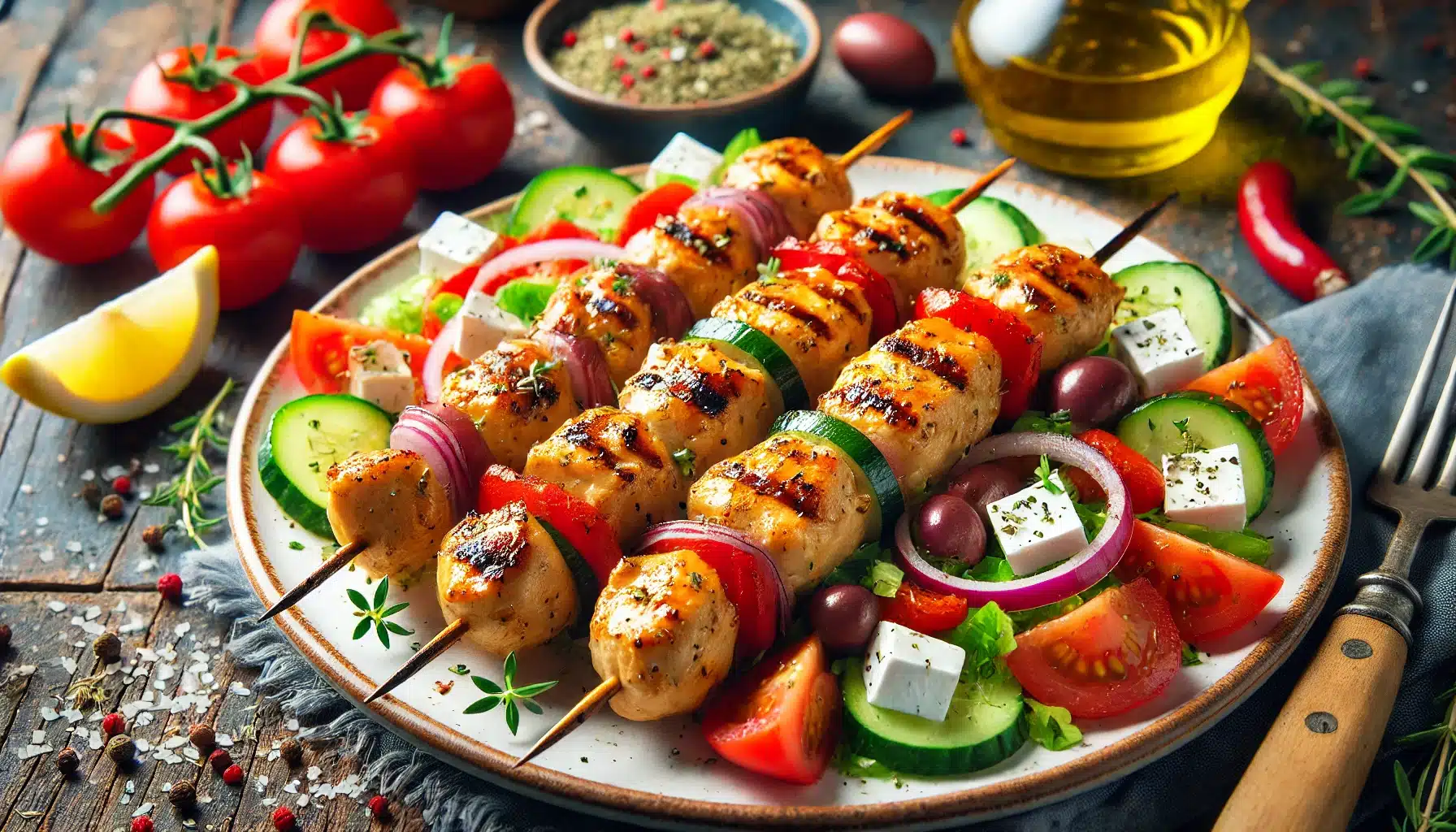 Σουβλάκια κοτόπουλο με σαλάτα χωριάτικη