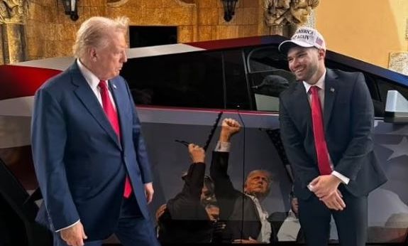 «Ουάου! «Αυτό είναι Έλον», είπε ο Τραμπ όταν ο Ρος του έδειξε το Tesla Cybertruck. Το αυτοκίνητο ήταν διακοσμημένο με μια φωτογραφία του Τραμπ με τη γροθιά του υψωμένη στον αέρα μετά την απόπειρα δολοφονίας εναντίον του στις 13 Ιουλίου.