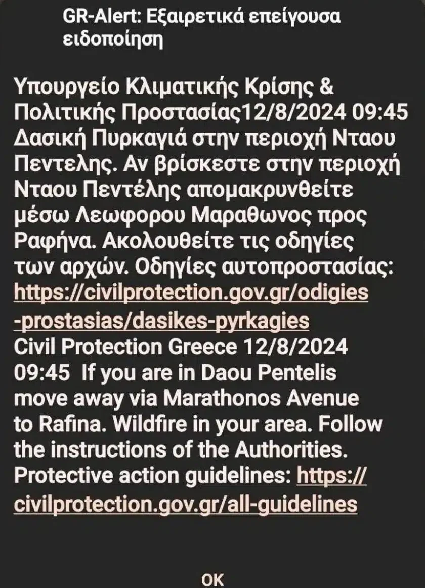 Μάλιστα, λίγο πριν τις 10:00 ήχησε νέο 112 για εκκένωση. Το μήνυμα αναφέρει χαρακτηριστικά: «Δασική πυρκαγιά στην περιοχή σας. Αν βρίσκεστε στη Νταού Πεντέλης, απομακρυνθείτε προς Ραφήνα, μέσω Λεωφόρου Μαραθώνος».
