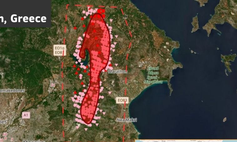 H Ομάδα του Copernicus παρουσίασε το γράφημα με την περιοχή που καίγεται στην Αττική.