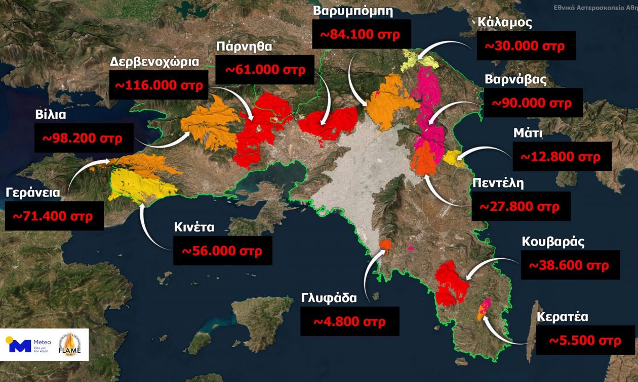 Η συνολική επιφάνεια της Περιφέρειας Αττικής (χωρίς την περιοχή της Τροιζηνίας, των νησιών και του Λεκανοπεδίου) είναι 2.500.000 στρέμματα, οπότε τα τελευταία οκτώ έτη, το 26% της συνολικής επιφάνειας έχει καεί από δασικές πυρκαγιές.