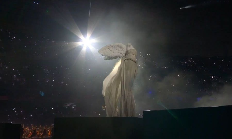 Συνεχίζοντας, ο Μητροπολίτης ερμηνεύει την τελετή με βάση τη βιβλική ιστορία της πτώσης του Διαβόλου από τον Ουρανό στη Γη. Αναφέρει πως η σκηνή της καθόδου του «Χρυσού Ταξιδευτή» από την κορυφή του «Stade de France» αποτυπώνει, σύμφωνα με εκκλησιαστικούς κύκλους, αυτήν ακριβώς τη στιγμή.