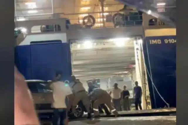 Μετά την εκφόρτωση η κακοκαιρία «χτύπησε» το πλοίο με αποτέλεσμα ένα αυτοκίνητο να αδυνατεί να ανέβει, με τους επιβάτες και μέλη του πληρώματος να προσπαθούν μάταια να το σπρώξουν ενώ και οι ίδιοι φαίνονται να τρέχουν να επιβιβαστούν, με κίνδυνο να πέσουν στη θάλασσα.