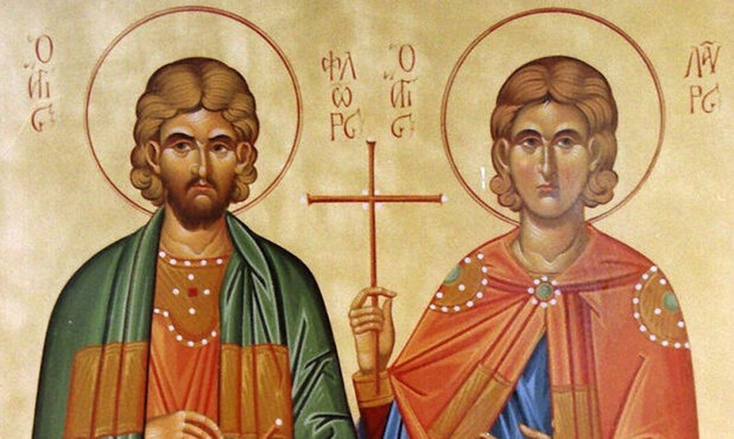 Σύμφωνα με τον συναξαριστή, οι Άγιοι Φλώρος και Λαύρος ήταν δίδυμα αδέλφια και ήταν άρρηκτα ενωμένοι δια της θερμής πίστεως και αγάπης που είχαν προς το Χριστό. Κατάγονταν από το Βυζάντιο και είχαν διδαχθεί το χριστιανισμό και την τέχνη του λιθοξόου από τους Αγίους Πρόκλο (ή Πάτροκλο σύμφωνα με τον Άγιο Νικόδημο) και Μάξιμο, οι όποιοι υπέστησαν και μαρτυρικό θάνατο για το Χριστό.