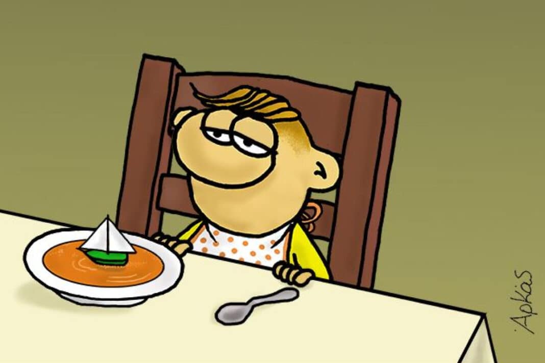 Στο σκίτσο, ο Θανασάκης κάθεται μπροστά σε ένα πιάτο με σούπα, στην οποία επιπλέει ένα καραβάκι, ένα σύμβολο των καλοκαιρινών περιπετειών που τώρα έχουν τελειώσει. Η μητέρα του τον ρωτά αν του αρέσει η σούπα, αλλά η έκφρασή του δείχνει ξεκάθαρα τη δυσαρέσκειά του. Ο Αρκάς, μέσω αυτής της εικόνας, εκφράζει την αίσθηση πλήξης και απογοήτευσης που νιώθουμε όταν το καλοκαίρι τελειώνει και επιστρέφουμε στις καθημερινές υποχρεώσεις.