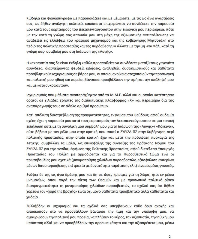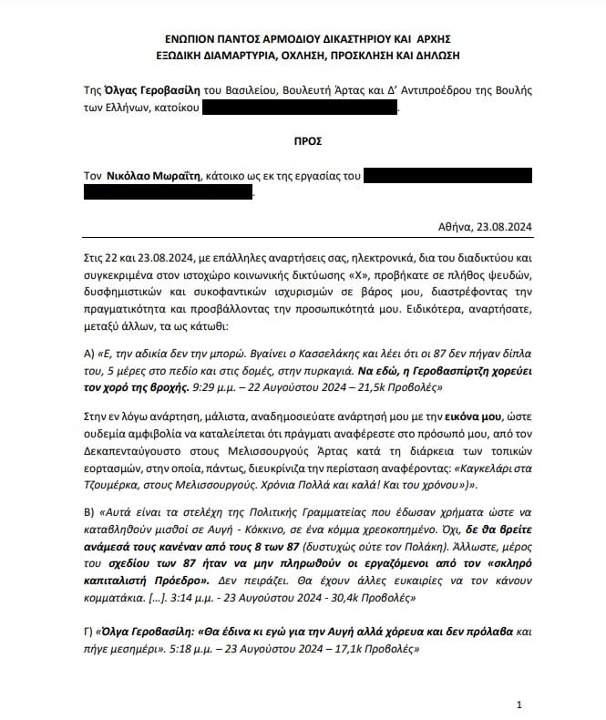 Εξώδικο απέστειλε η Όλγα Γεροβασίλη, Δ’ Αντιπρόεδρος της ΒτΕ και Βουλευτής Άρτας του ΣΥΡΙΖΑ – Προοδευτική Συμμαχία στον στιχουργό Νίκο Μωραΐτη, με το οποίο τον καλεί να ανακαλέσει τις δυσφημιστικές σε βάρος της αναρτήσεις του στο “Χ”.