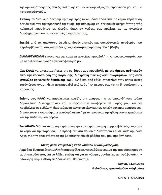 Σε αυτό το πλαίσιο, η κα Γεροβασίλη ζητά την αποκατάσταση της ηθικής βλάβης που υπέστη διαφορετικά επιφυλάσσεται για περαιτέρω δικαστικές ενέργειες.