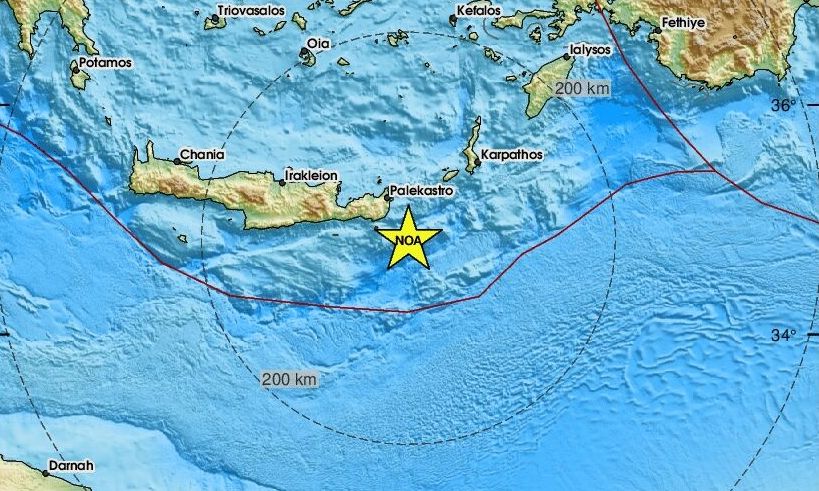 Το ακριβές επίκεντρο τη δόνησης εντοπίζεται στα 55 χλμ. νοτιοανατολικά της Σητείας.