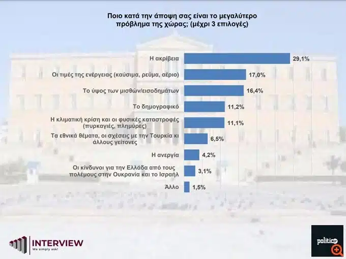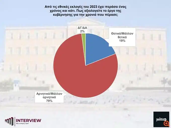 Η δυσαρέσκεια των πολιτών αποτυπώνεται επίσης στη γενική αξιολόγηση του κυβερνητικού έργου, όπου το 79% των ερωτηθέντων εκφράζει αρνητική γνώμη. Η ακρίβεια, οι τιμές της ενέργειας και το ύψος των μισθών αποτελούν τα κυριότερα προβλήματα που αντιμετωπίζει η χώρα, ενώ η οικονομική κρίση φαίνεται να βαθαίνει την απογοήτευση των πολιτών​.