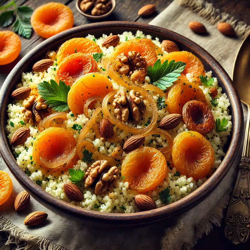 Η σαλάτα με κουσκούς, βερίκοκα και καραμελωμένα κρεμμύδια είναι μια φρέσκια και γευστική επιλογή που συνδυάζει την αφράτη υφή του κουσκούς με τη γλυκιά γεύση των αποξηραμένων βερίκοκων και την πλούσια γεύση των καραμελωμένων κρεμμυδιών. Αυτή η σαλάτα είναι ιδανική τόσο ως συνοδευτικό όσο και ως ελαφρύ κυρίως γεύμα. Τα αρώματα της Ανατολής ενώνονται σε ένα πιάτο γεμάτο γεύση και χρώμα, προσφέροντας ένα πρωτότυπο και απολαυστικό γευστικό ταξίδι.