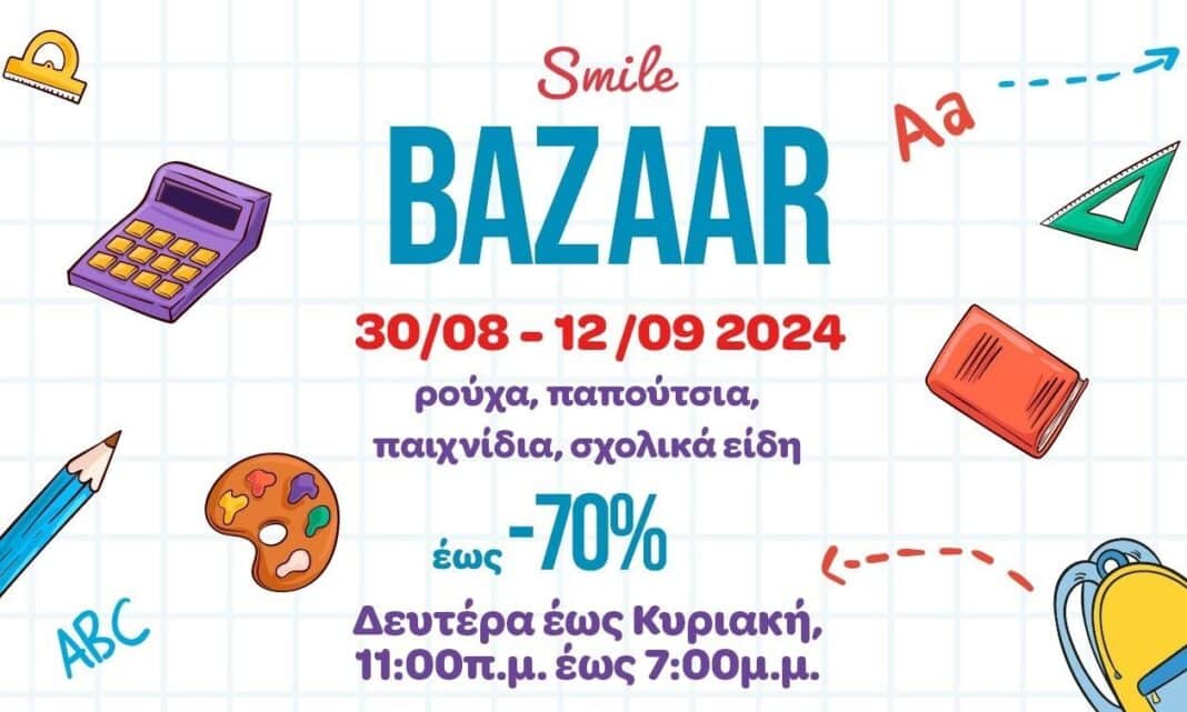 Σας προσκαλούμε με μεγάλη χαρά στο καθιερωμένο φθινοπωρινό Smile Bazaar του Οργανισμού «Το Χαμόγελο του Παιδιού», που θα υλοποιηθεί από 30 Αυγούστου έως 12 Σεπτεμβρίου 2024, με δωρεάν είσοδο, στους χώρους του Οργανισμού στην Αγία Παρασκευή, Γαρυττού 80, 5ος όροφος (πλησίον μετρό Αγ. Παρασκευής).