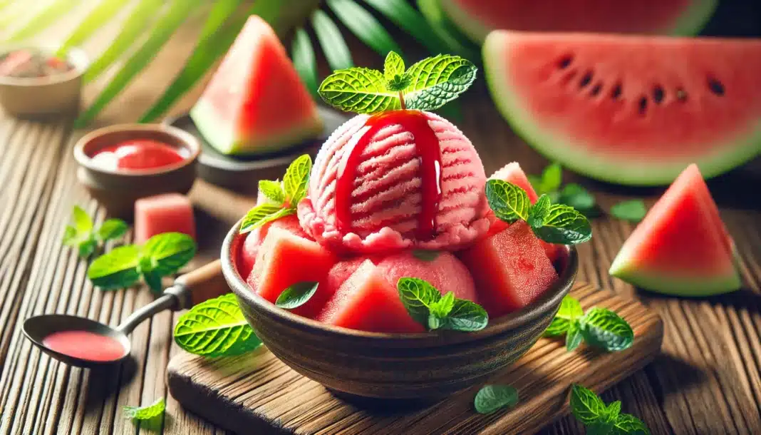 - Σερβίρισμα: Σερβίρετε το παγωτό καρπούζι σε μπολ, γαρνίροντας με φρέσκα κομμάτια καρπουζιού ή φύλλα μέντας για επιπλέον φρεσκάδα.