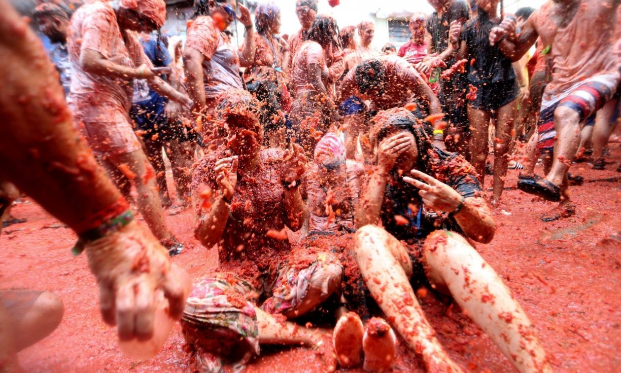 Οι δρόμοι του Μπουνιόλ, στην ανατολική Ισπανία, βάφτηκαν κόκκινοι την Τετάρτη, καθώς χιλιάδες κάτοικοι και επισκέπτες επιδόθηκαν σε ντοματοπόλεμο, εκτοξεύοντας υπερώριμες ντομάτες στο παραδοσιακό φεστιβάλ «Τοματίνα».