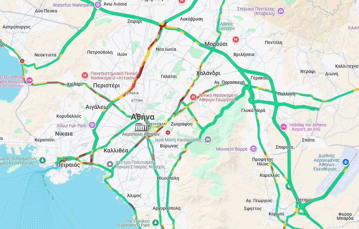 Κίνηση υπάρχει επίσης και στα δύο ρεύματα της λεωφόρου Λιοσίων καθώς και σε πολλούς κεντρικούς δρόμους του κέντρου της Αθήνας.