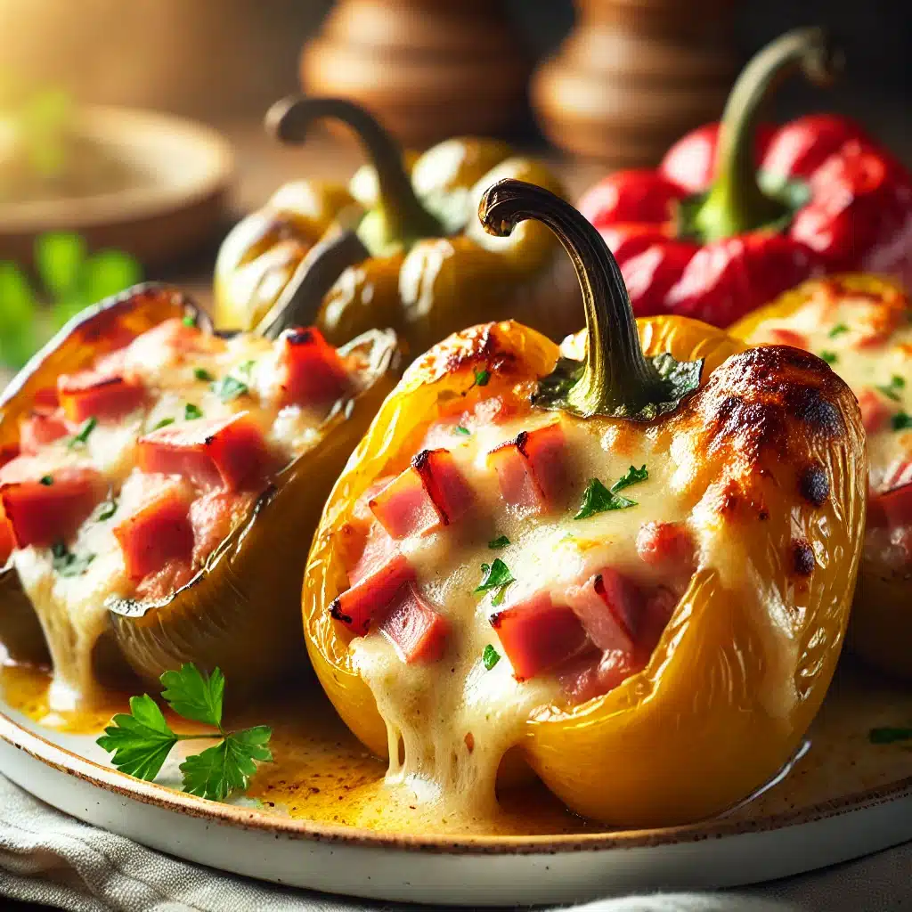 Σερβίρετε τις γεμιστές πιπεριές με τυρί και ζαμπόν ζεστές, απολαμβάνοντας την πλούσια, κρεμώδη γεύση τους.