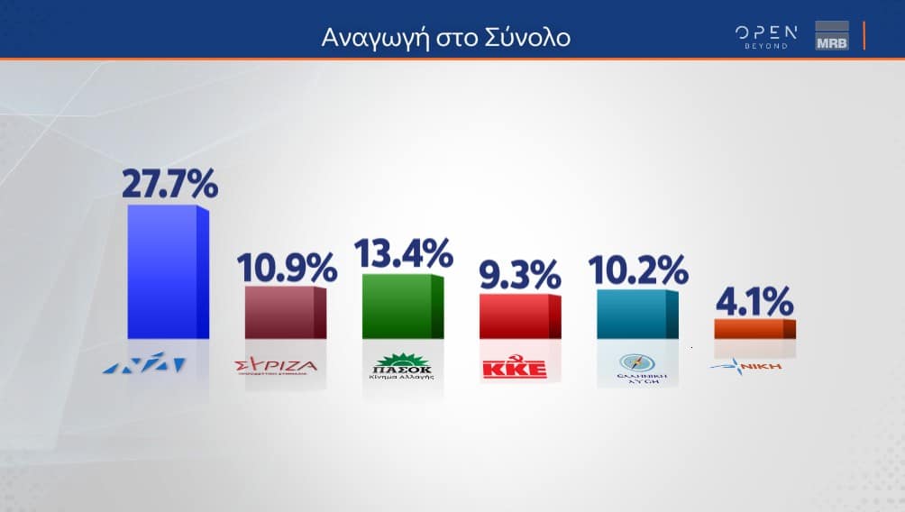 Δημοσκόπηση MRB: Διατηρεί δυνάμεις η ΝΔ – Δεύτερο κόμμα το ΠΑΣΟΚ, 4 μονάδες κάτω ο ΣΥΡΙΖΑ