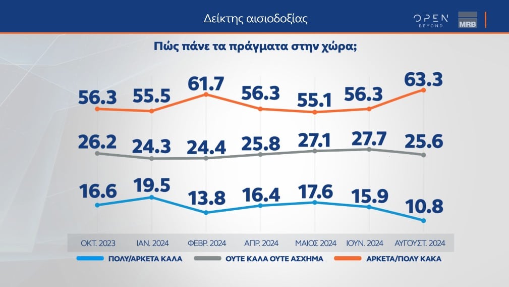 Σε δημοσκόπηση της MRB για το OPEN καταδεικνύεται η δυσαρέσκεια των πολιτών, καθώς ο δείκτης ασιοδοξίας βρίσκεται στο ναδίρ και στο 10,8%.