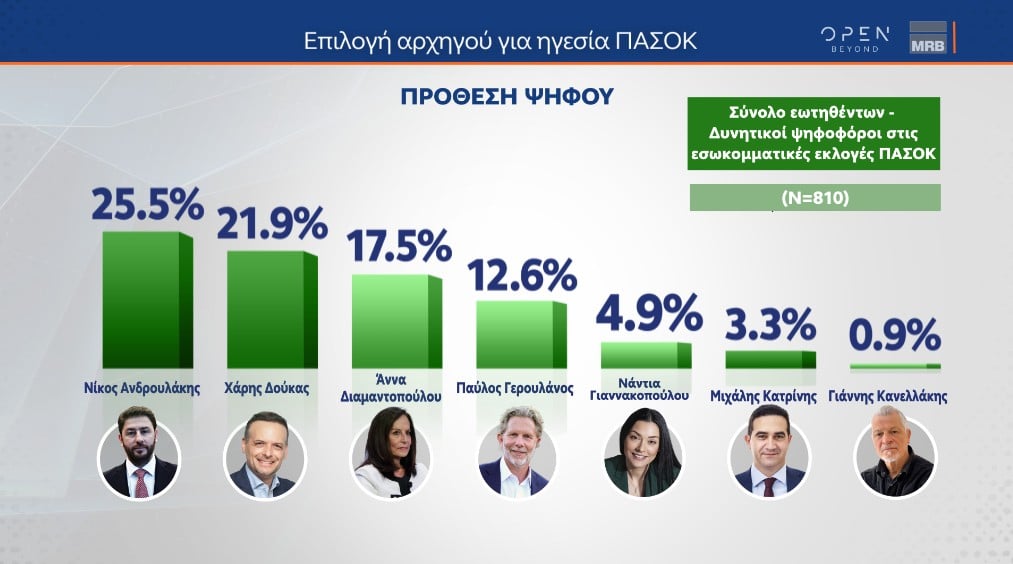 Συγκεκριμένα, στο σύνολο των ερωτηθέντων (δυνητικοί ψηφοφόροι στις εσωκομματικές εκλογές του ΠΑΣΟΚ), ο Νίκος Ανδρουλάκης είναι πρώτος με 25.5% και ακολουθούν οι: Χάρης Δούκας (21.9%), Άννα Διαμαντοπούλου (17.5%), Παύλος Γερουλάνος (12.6%), Νάντια Γιαννακοπούλου (4.9), Μιχάλης Κατρίνης (3.3%) και Γιάννης Κανελλάκης (0.9%).