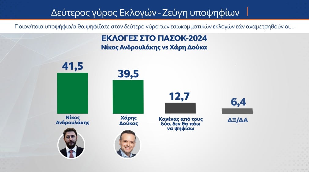 Όσον αφορά τα ζεύγη των υποψηφίων στον δεύτερο γύρο, το ντέρμπι συνεχίζεται, αφού ο Νίκος Ανδρουλάκης συγκεντρώνει 41.5% και ο Χάρης Δούκας ακολουθεί σε απόσταση… αναπνοής με 39,5%.