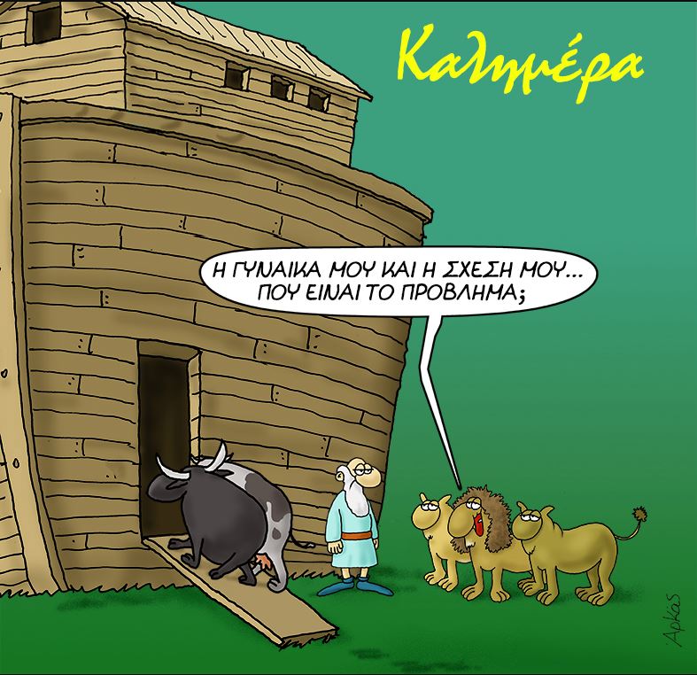 Αρκάς: Ο γνωστός σκιτσογράφος μάς καλημερίζει για άλλη μια φορά με ένα ευφυές και χιουμοριστικό σκίτσο, εμπνευσμένο από την ιστορία της Κιβωτού του Νώε. Αυτή τη φορά, το επίκεντρο είναι οι λιοντάρια που παρουσιάζονται όχι ως το αναμενόμενο ζευγάρι, αλλά ως τρίο, με τον λέοντα να δηλώνει χαλαρά ότι έχει και σύζυγο και σχέση. Ο Αρκάς, με το χαρακτηριστικό του χιούμορ, σχολιάζει με έναν διασκεδαστικό τρόπο τις σύγχρονες σχέσεις και την πολυπλοκότητά τους.