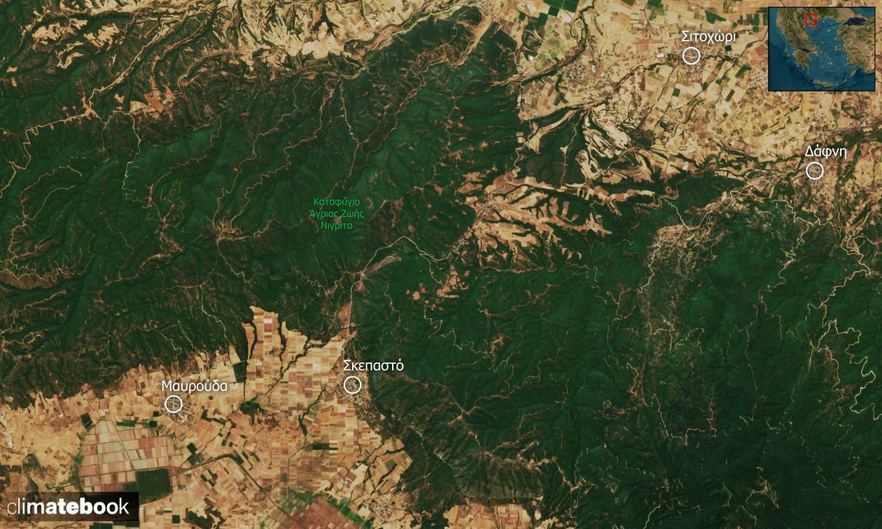 Πιο συγκεκριμένα στις παρακάτω δορυφορικές εικόνες που επεξεργάστηκε η επιστημονική ομάδα του climatebook παρουσιάζεται η κατάσταση του δάσους στα όρια του νομού Θεσσαλονίκης και Σερρών στην περιοχή του Νιγρίτα στα τέλη Αυγούστου 2023 σε σύγκριση με τη φετινή περίοδο στα τέλη του Αυγούστου 2024.