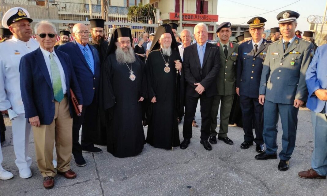 Τον Πατριάρχη υποδέχθηκε ο περιφερειάρχης Βορείου Αιγαίου Κωνσταντίνος Μουτζούρης, μαζί με εκπροσώπους των πολιτικών και στρατιωτικών αρχών του τόπου, με τιμές αρχηγού κράτους.