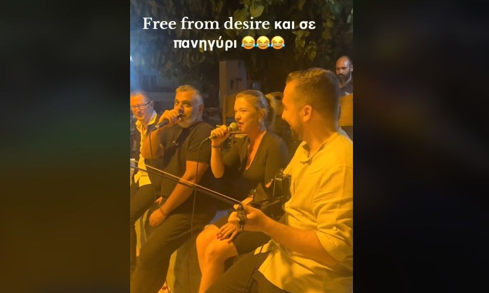 Πιο συγκεκριμένα, όλα ξεκίνησαν όταν ένα μαγαζί της περιοχής έπαιζε δυνατά ξένη μουσική κοντά στην πλατεία που είχε στηθεί το πανηγύρι και αποφάσισαν να παίξουν το Freed from Desire, με βίντεο τους να σαρώνει τα social media.