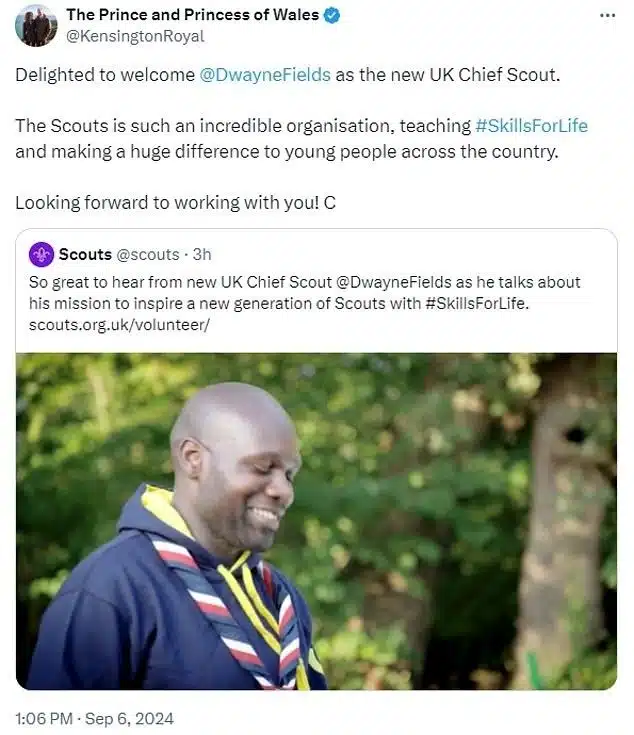 Έγραψε: «Με χαρά καλωσορίζω τον @DwayneFields ως τον νέο επικεφαλής προσκόπων του Ηνωμένου Βασιλείου. Οι πρόσκοποι είναι μια τόσο απίστευτη οργάνωση, που διδάσκει δεξιότητες οι οποίες είναι χρήσιμες για μια ζωή και κάνει τεράστια διαφορά στους νέους σε όλη τη χώρα. Ανυπομονώ να δουλέψω μαζί σου! C.’
