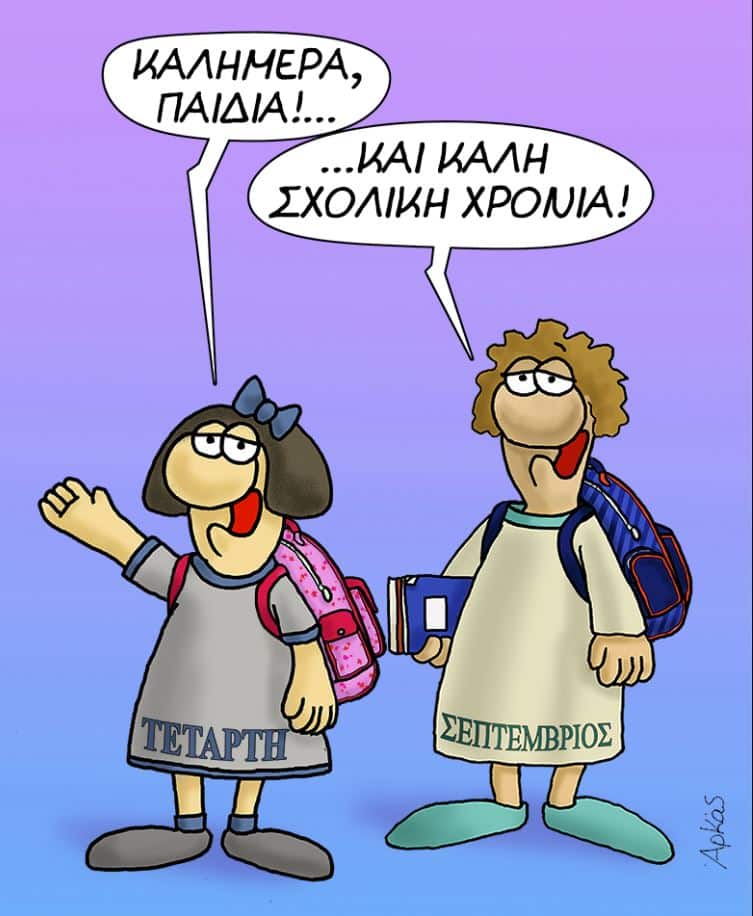 Με ένα ιδιαίτερα εύστοχο και επίκαιρο σκίτσο μας καλημερίζει ο Αρκάς σήμερα, 11 Σεπτεμβρίου 2024, ημέρα αγιασμού στα σχολεία και έναρξης της νέας σχολικής χρονιάς. Ο γνωστός σκιτσογράφος, με την αγαπημένη του αίσθηση του χιούμορ και τη σατιρική του ματιά, αφιερώνει τη σημερινή του «Καλημέρα» στους μαθητές που επιστρέφουν στα θρανία.