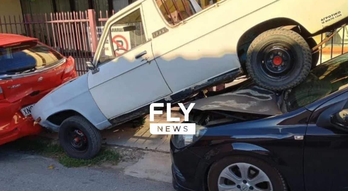 Συγκεκριμένα, σύμφωνα με το flynews.gr, η οδηγός ενός κόκκινου οχήματος, για άγνωστη μέχρι στιγμής αιτία, κάνοντας όπισθεν, χτύπησε ένα λευκό αγροτικό, το οποίο με τη σειρά του «καβάλησε», λόγω της μεγάλης δύναμης που αναπτύχθηκε, ένα μαύρο ΙΧ που ήταν σταθμευμένο ακριβώς πίσω.