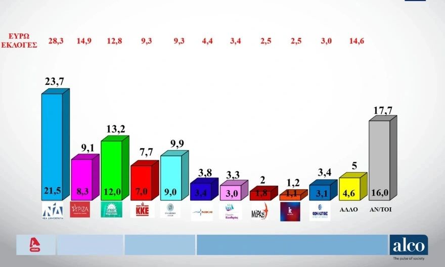 Αν και προηγείται η Νέα Δημοκρατία καταγραφεί μικρότερα ποσοστά σε σχέση με τις ευρωεκλογές, που είχε συγκεντρώσει 28,3%. Μάλιστα, ένας στους τέσσερις ψηφοφόρους της δηλώνει αναποφάσιστος.