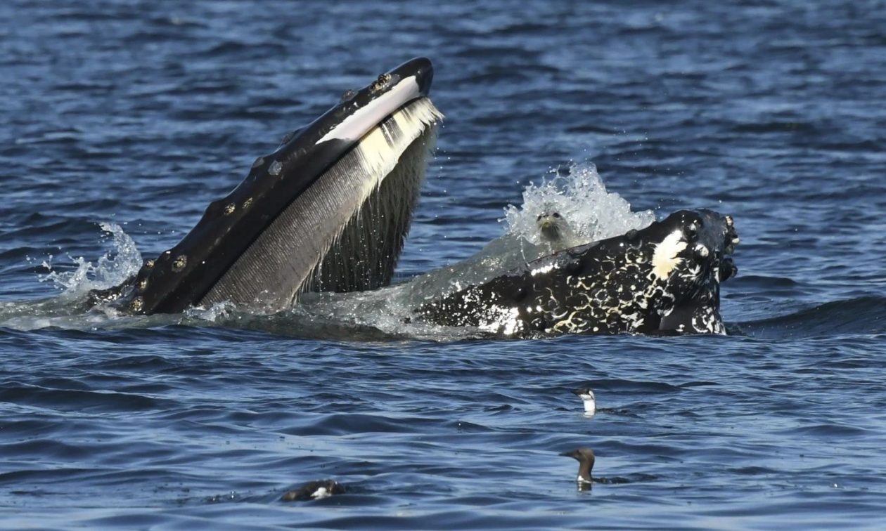 Η φωτογραφία ενός φυσιολάτρη που παρακολουθεί φάλαινες απαθανάτισε μια φαινομενικά σαστισμένη φώκια στο στόμα μιας μεγάπτερης φάλαινας, αφού το γιγάντιο θαλάσσιο θηλαστικό την καταβρόχθισε κατά λάθος την περασμένη Πέμπτη στα νερά έξω από το Anacortes της Ουάσινγκτον στις ΗΠΑ.