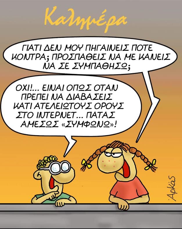 Ο Αρκάς γνωστός για το καυστικό του χιούμορ και τις αιχμηρές κοινωνικές παρατηρήσεις του, συχνά χρησιμοποιεί τη Ρόζα και τον Απόστολο ως μέσα για να αναδείξει διάφορα ζητήματα. Στο συγκεκριμένο σκίτσο, η μικρή Ρόζα παραπονιέται γιατί ο φίλος της, ο Απόστολος, δεν της πάει ποτέ κόντρα. Απαιτεί να μάθει αν προσπαθεί να γίνει πιο συμπαθής απέναντί της. Η απάντηση του Απόστολου είναι ξεκαρδιστική και έξυπνη, καθώς συγκρίνει τη συμπεριφορά του με τη συνήθεια να αποδεχόμαστε γρήγορα τους ατελείωτους όρους χρήσης στο διαδίκτυο χωρίς να τους διαβάζουμε – πατάμε κατευθείαν «Συμφωνώ».