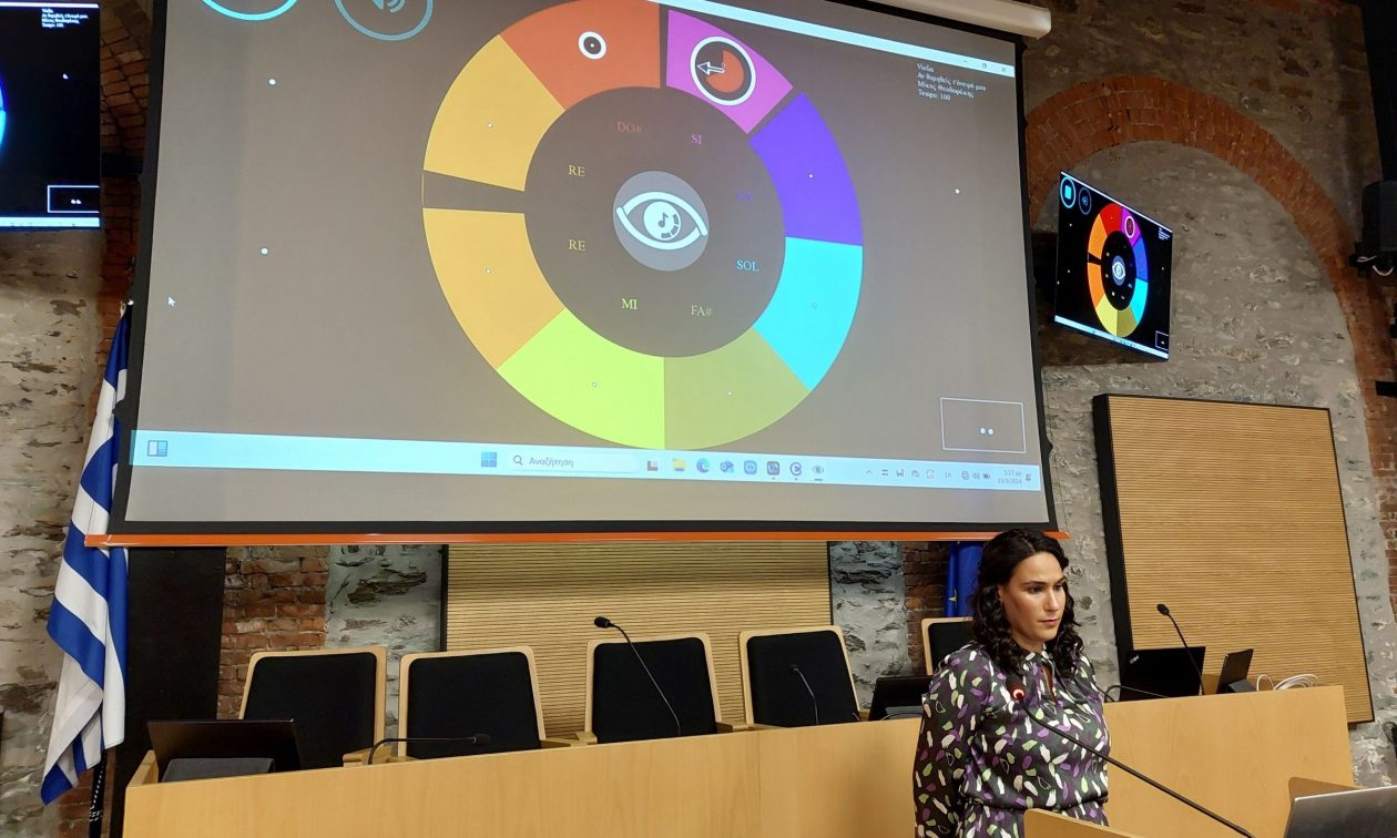 Η μελωδία από το «Χάρτινο το φεγγαράκι» του Μάνου Χατζηδάκη πλημμύρισε απόψε την αίθουσα συνεδριάσεων του περιφερειακού συμβουλίου Κεντρικής Μακεδονίας. Την ίδια στιγμή διαφορετικά χρώματα εμφανίζονταν στην οθόνη που βρίσκεται στο κέντρο της αίθουσας για να σηματοδοτήσουν τις νότες που εναλλάσσονταν η μία μετά την άλλη. Όσοι βρέθηκαν εκεί για να παρακολουθήσουν την ημερίδα της Περιφέρειας για την επαγγελματική εκπαίδευση, έβλεπαν μπροστά τους την εκπαιδευτικό Μαρία Βαρσαμά, να στέκεται όρθια απέναντι από έναν υπολογιστή και να παίζει μουσική. Τα χέρια της ήταν εντελώς ακίνητα, το ύφος της ήταν απολύτως προσηλωμένο στην οθόνη και το μόνο που κινούνταν ήταν οι κόρες των ματιών της….