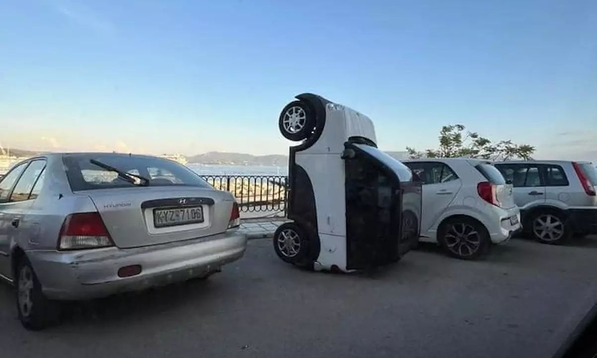 Πιο συγκεκριμένα, ένα αυτοκίνητο ήταν παρκαρισμένο κατακόρυφα πάνω από το Φαληράκι της Κέρκυρας και παραμένει άγνωστο πώς και για ποιο λόγο κατέληξε σε αυτή τη θέση.