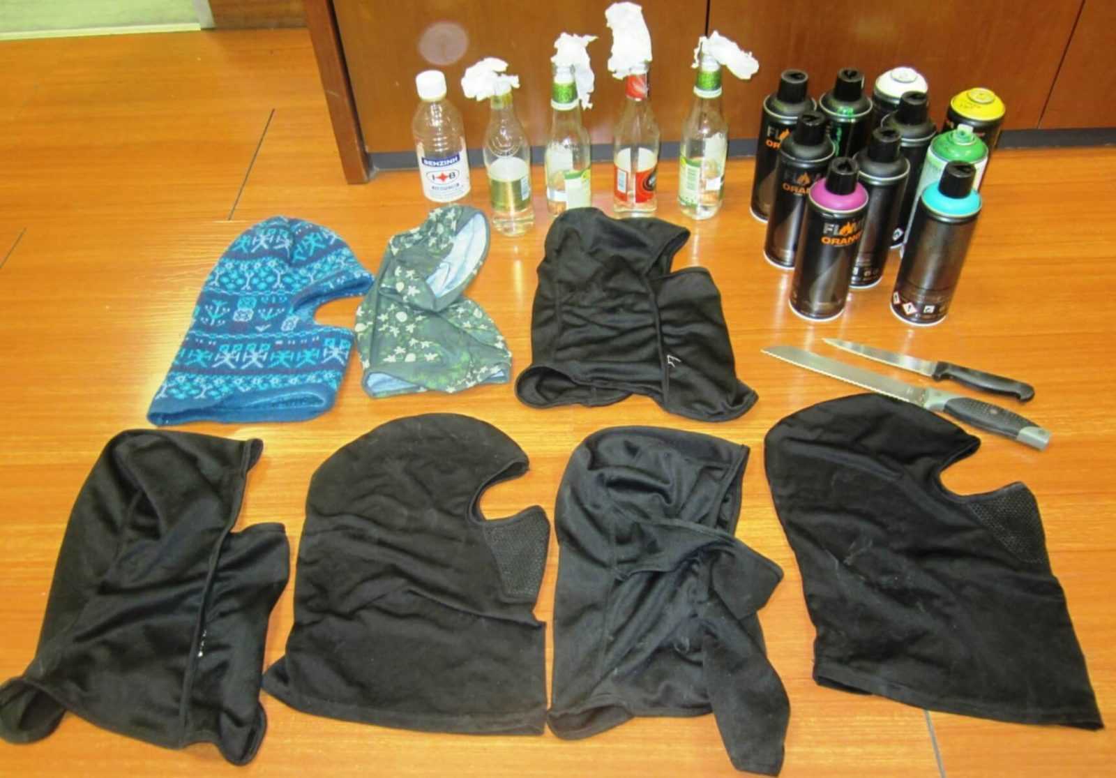Η ενημέρωση της αστυνομίας αναφέρει ότι οι επτά αλλοδαποί ηλικίας 15 και 16 ετών βρέθηκαν να έχουν στην κατοχή τους κουκούλες τύπου full face, τέσσερις μολότοφ, ένα πλαστικό μπουκάλι με εύφλεκτο υγρό, δύο μαχαίρια και δέκα μπουκάλια σπρέι για γκράφιτι.