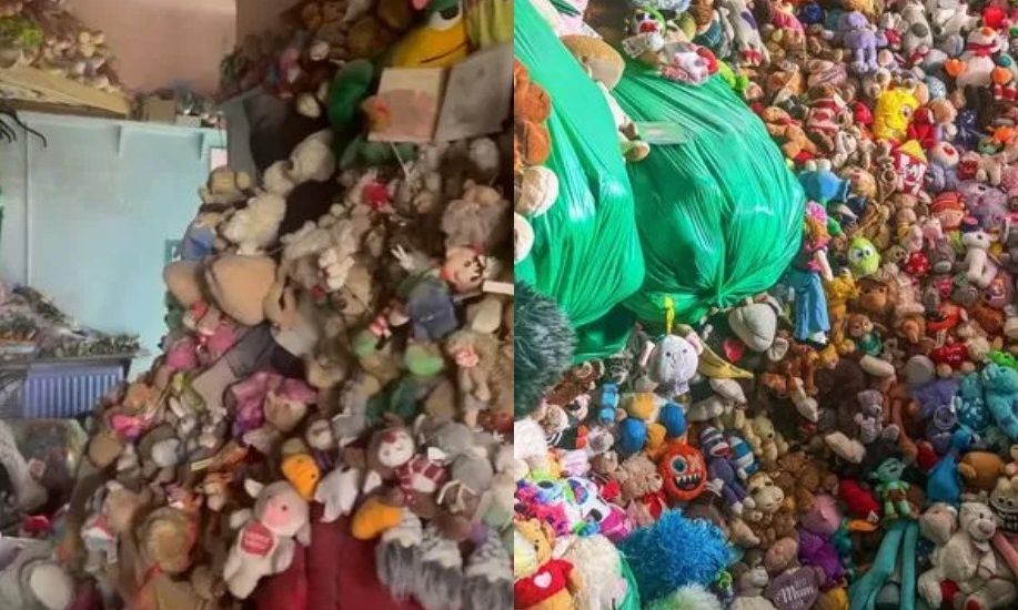 Μεταξύ της ποικιλίας παιχνιδιών που καταγράφονται στις εικόνες, ένα στιγμιότυπο δείχνει ένα βουνό από παιχνίδια με δύο αρκούδες που φέρουν τις καρδιές ‘I love you’ να κρυφοκοιτάζουν έξω.