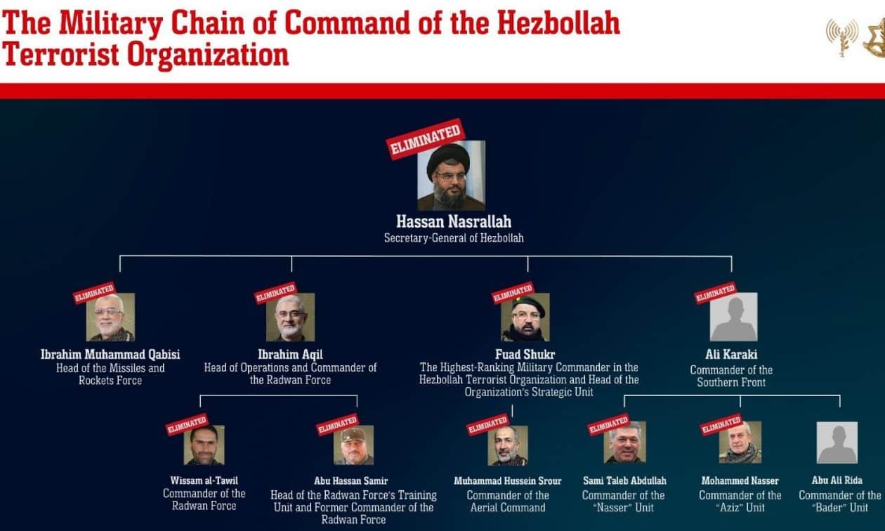 Την «αποσυναρμολόγηση» του δικτύου της Χεζμπολάχ μετά και τον θάνατο του ηγέτη της Χασάν Νασράλα, υποστηρίζει ότι πέτυχε ο ισραηλινός στρατός, δημοσιεύοντας μια φωτογραφία της ηγετικής ομάδας.