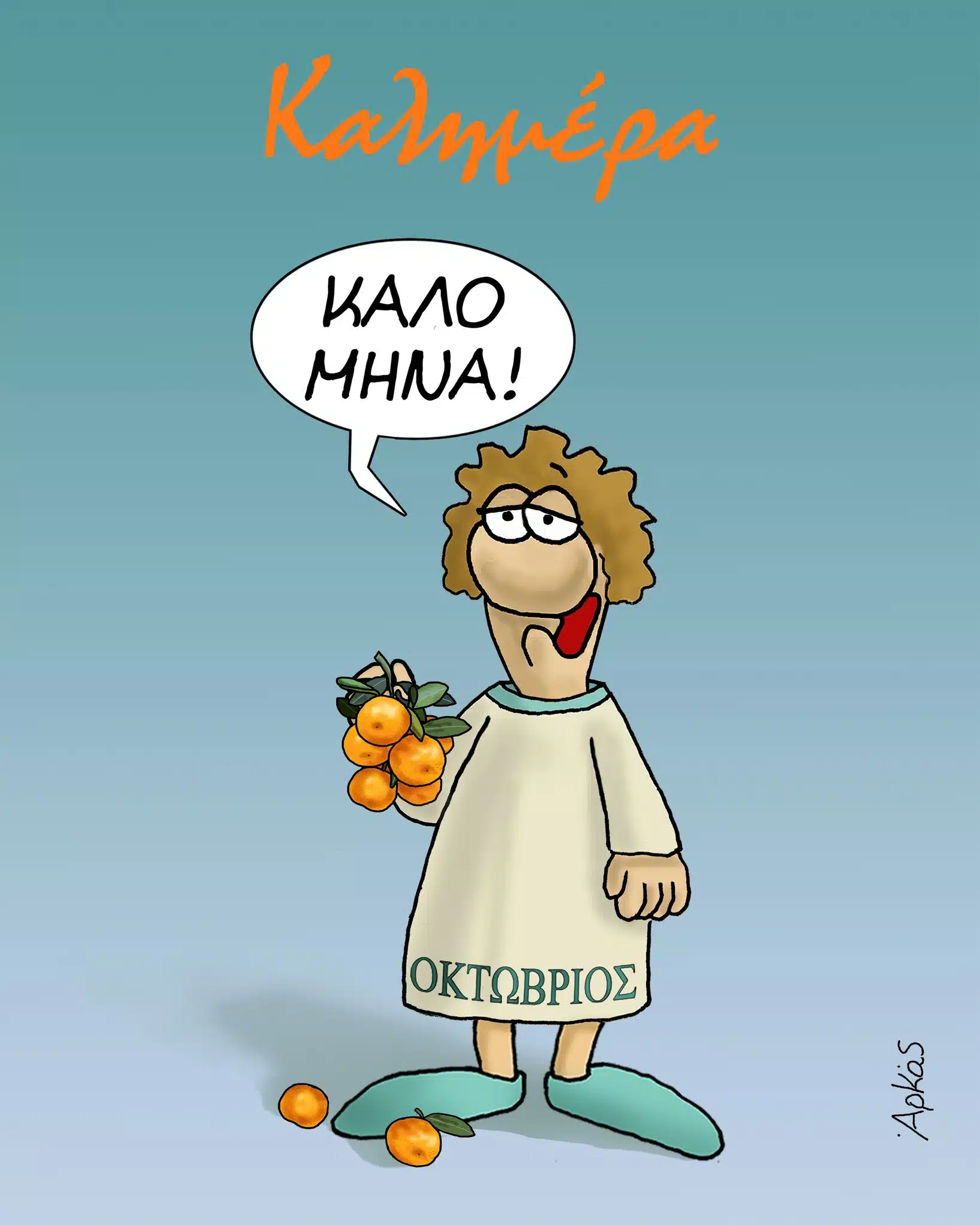 Ο Αρκάς , ένας από τους πιο αγαπητούς σκιτσογράφους της Ελλάδας, έχει καθιερώσει την παράδοση να εύχεται «Καλό μήνα» με χιουμοριστικά και συχνά σαρκαστικά σκίτσα, που απεικονίζουν τους μήνες με ανθρώπινη μορφή. Την 1η Οκτωβρίου, επέλεξε να καλωσορίσει τον Οκτώβρη με το γνωστό του στυλ, δείχνοντας έναν χαρακτήρα που κρατάει μανταρίνια, σύμβολο της εποχής, και εύχεται «Καλό μήνα» με ένα ύφος χαλαρό αλλά χιουμοριστικό, όπως συνηθίζεται στις δημιουργίες του.