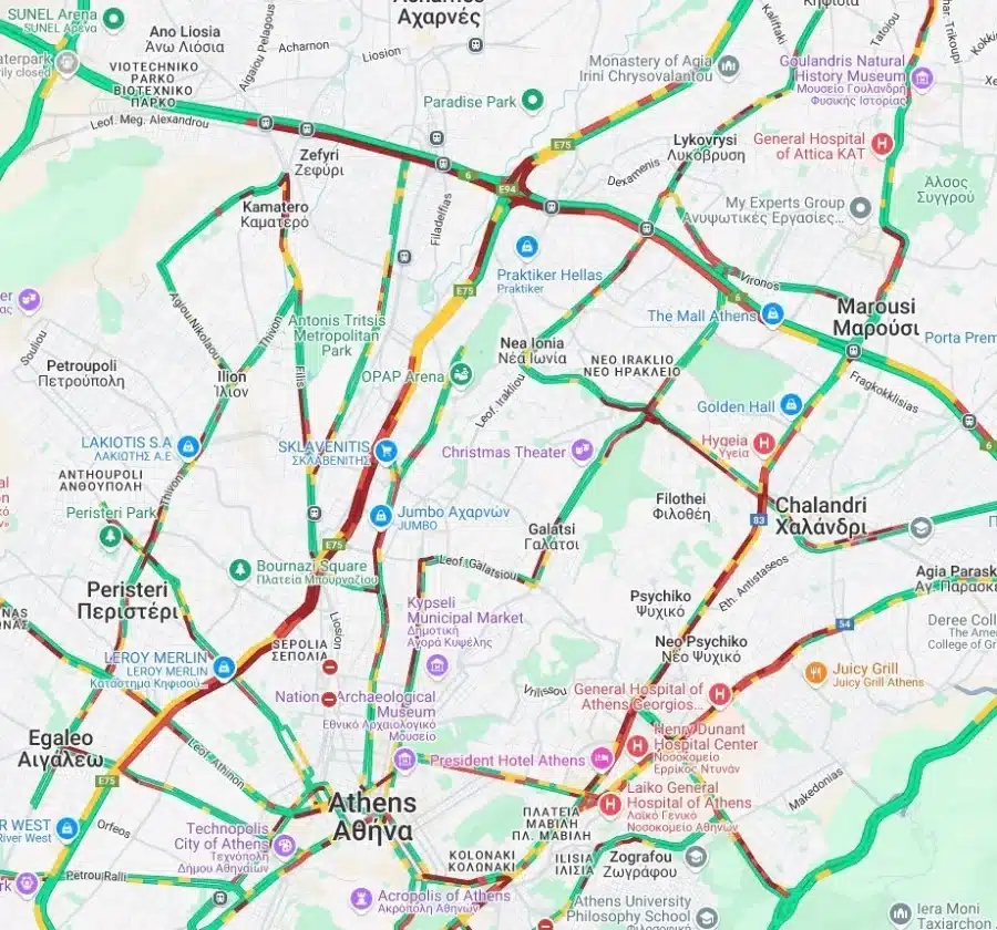 Παράλληλα, στο «κόκκινο» βρίσκεται η Λεωφόρος Κηφισού από το Αιγάλεω μέχρι και την Κηφισιά αλλά και η Λεωφόρος Κηφισίας από το Μαρούσι μέχρι τους κεντρικούς δρόμους της Αθήνας.