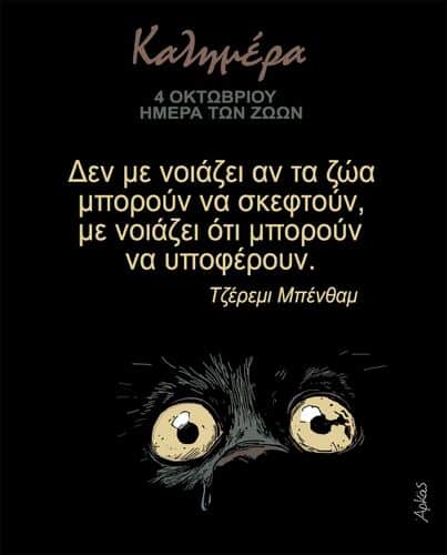 Φέτος, ο γνωστός σκιτσογράφος Αρκάς επέλεξε να συμμετάσχει στον εορτασμό της παγκόσμιας ημέρας των ζώων με ένα μήνυμα βαθιάς σημασίας. Στο σκίτσο του, παρουσιάζει ένα ζώο με δύο κίτρινα μάτια σε μαύρο φόντο, συνοδευόμενο από τη φράση του Τζέρεμι Μπένθαμ, «δεν με νοιάζει αν τα ζώα μπορούν να σκεφτούν, με νοιάζει ότι μπορούν να υποφέρουν». Αυτή η φράση συμπυκνώνει το ηθικό θεμέλιο της καμπάνιας για τα δικαιώματα των ζώων, τονίζοντας ότι η ικανότητα των ζώων να νιώθουν πόνο είναι το κριτήριο με βάση το οποίο πρέπει να τα σεβόμαστε.