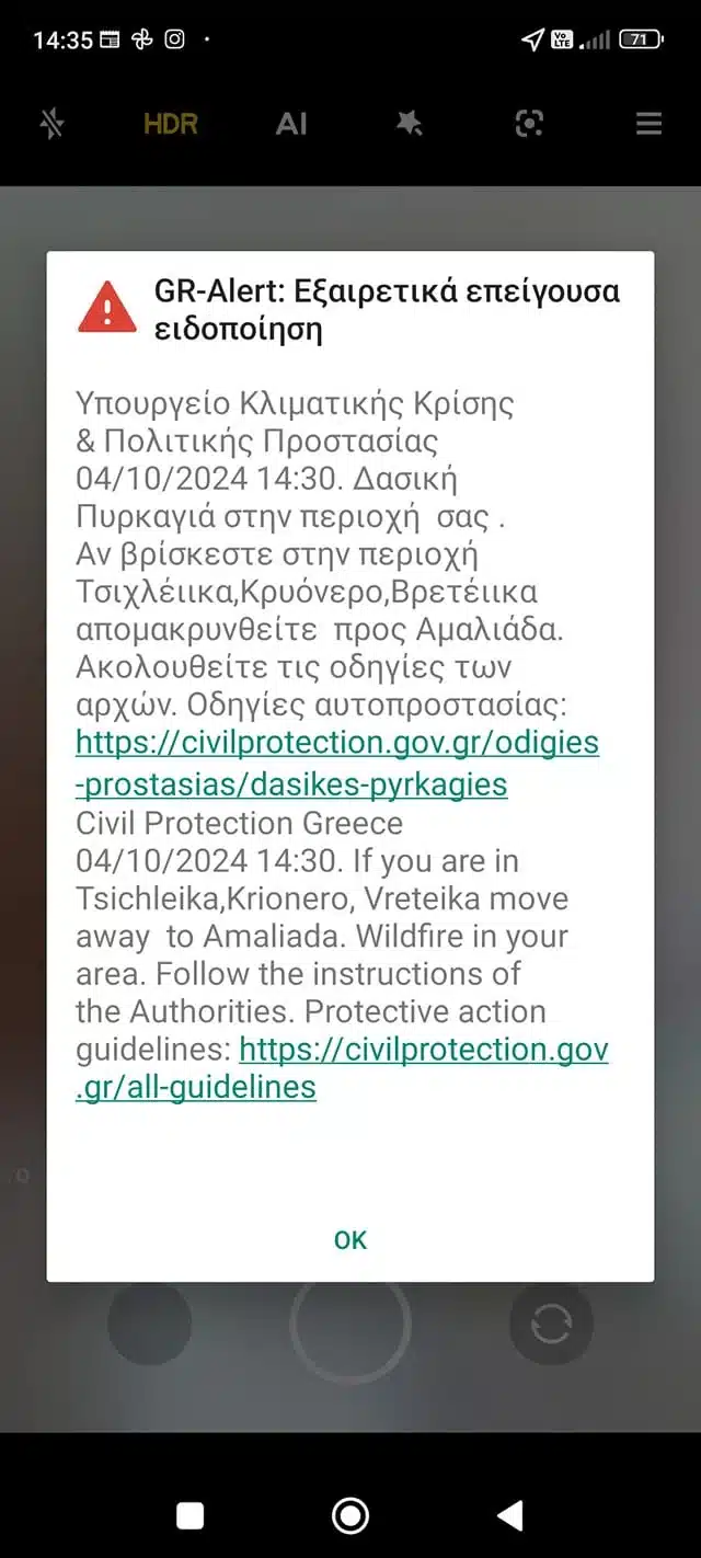 Παράλληλα, λόγω της φωτιάς που ξέσπασε στην Αμαλιάδα, ήχησε το 112 στα κινητά των κατοίκων των περιοχών Τσιχλέικα, Κρυόνερο και Βρετέικα να απομακρυνθούν προς Αμαλιάδα και να ακολουθήσουν τις οδηγίες των Αρχών.