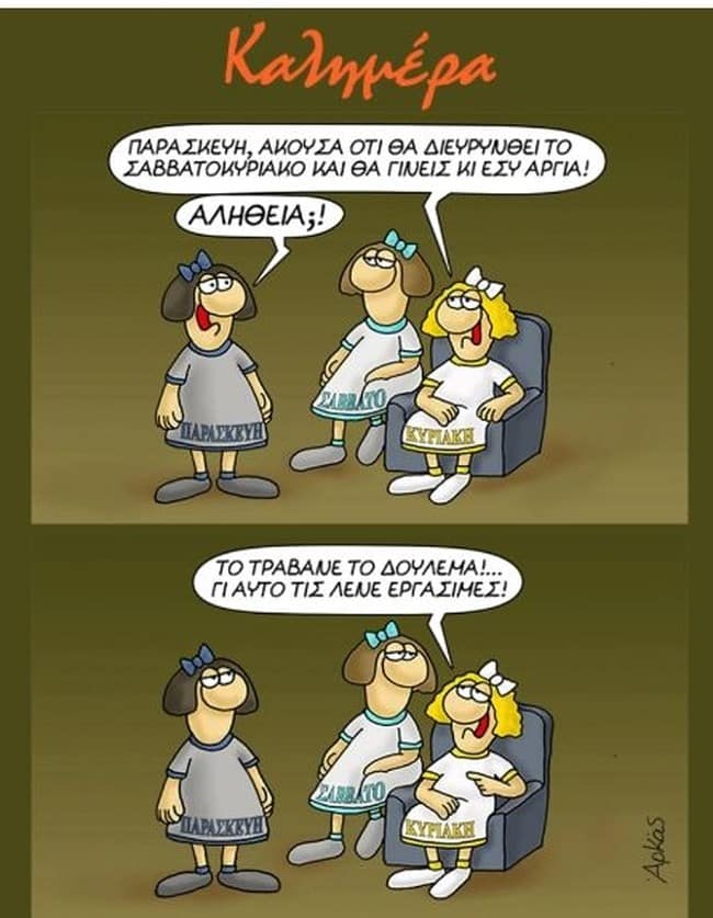 Ο Αρκάς επιστρέφει με άλλο ένα απολαυστικό σκίτσο που σατιρίζει την καθημερινή ζωή. Στο νέο του σχέδιο, παρουσιάζει την Παρασκευή, το Σάββατο και την Κυριακή να συζητούν για τη διεύρυνση του Σαββατοκύριακου. Η Παρασκευή ακούει από το Σάββατο πως το Σαββατοκύριακο μπορεί να επεκταθεί και αυτή θα γίνει επίσης αργία, γεγονός που την εκπλήσσει και την ενθουσιάζει. Η Κυριακή όμως απαντά με χιούμορ λέγοντας: «Το τραβάνε το δούλεμα, γι’ αυτό τις λένε εργάσιμες!», σχολιάζοντας έτσι τη συνεχή αύξηση των απαιτήσεων και των “εργάσιμων” ημερών.