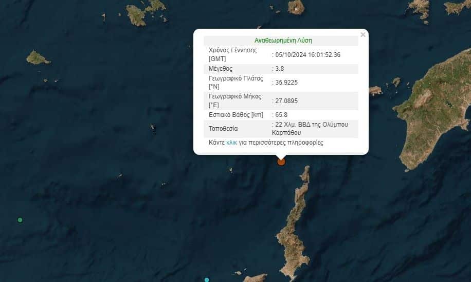 Ο σεισμός σημειώθηκε ένα λεπτό μετά τις 19:00 22 χιλιόμετρο βορειοδυτικά της Ολύμπου Καρπάθου.