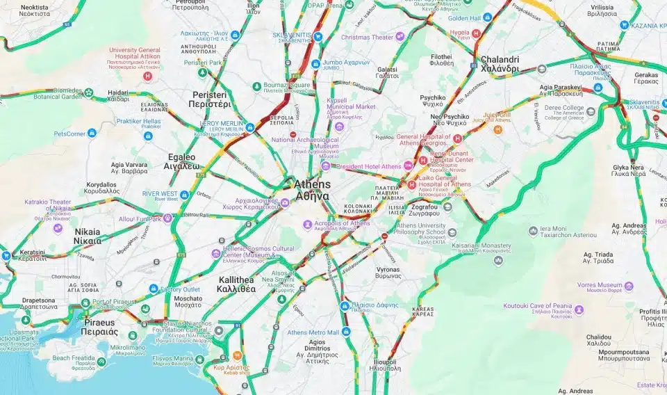 • Λιμάνι του Πειραιά: Η κυκλοφορία είναι επίσης δύσκολη στους δρόμους γύρω από το λιμάνι, κυρίως λόγω της αυξημένης κίνησης φορτηγών​.