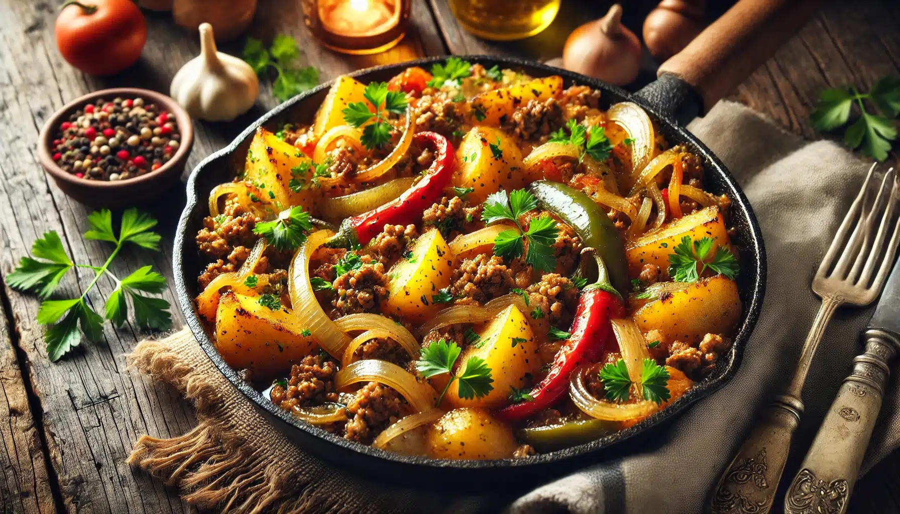 Κιμάς με πατάτες και λαχανικά στο τηγάνι