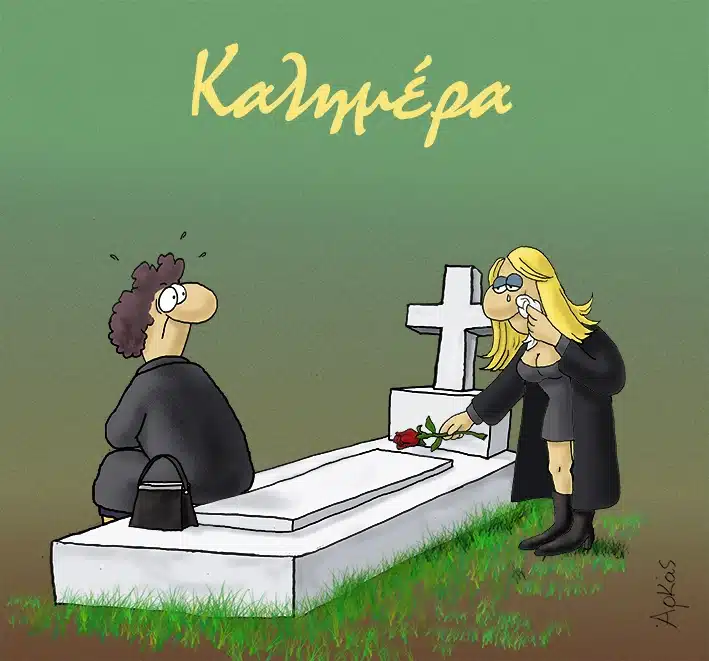 Αρκάς: Η καλημέρα της Τρίτης από τον αγαπημένο σκιτσογράφο της καρδιάς μας, αν και σε πρώτο χρόνο στενάχωρη προκαλεί γέλια και κλάματα αμέσως μετά. Στο σκίτσο, μια μαυροφορεμένη γυναίκα, θρηνώντας τον αγαπημένο της σε ένα νεκροταφείο, έρχεται αντιμέτωπη με μια αναπάντεχη αποκάλυψη. Ενώ στέκεται πάνω από τον τάφο, εμφανίζεται μια ξανθιά γυναίκα που αφήνει τριαντάφυλλα στον ίδιο τάφο, υπονοώντας την ύπαρξη διπλής ζωής του νεκρού.