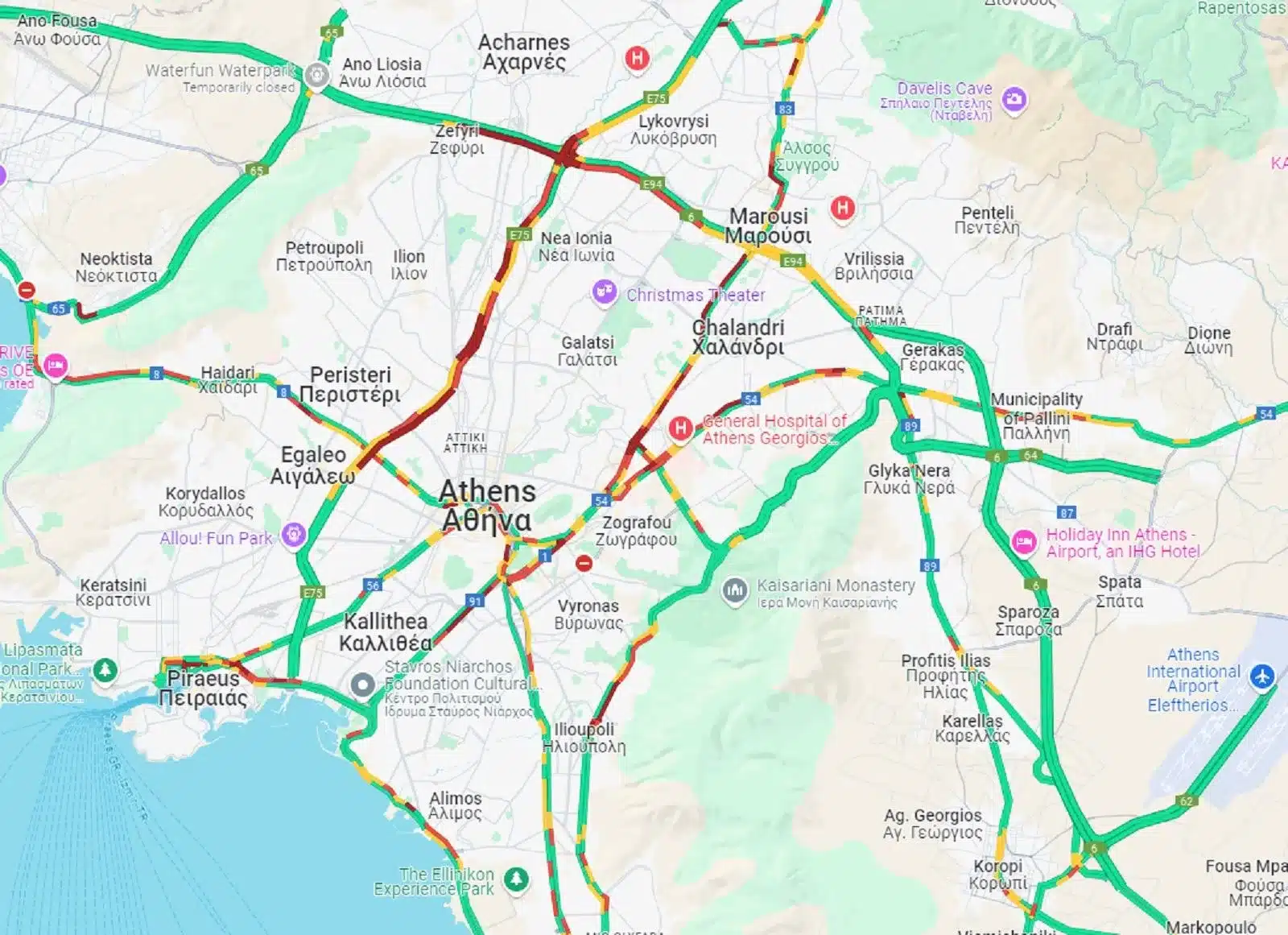 Σημαντικές καθυστερήσεις καταγράφονται και στην Αττική Οδό, με τους οδηγούς στο ρεύμα προς το αεροδρόμιο να αντιμετωπίζουν καθυστερήσεις 25-30 λεπτών, ειδικά από τον κόμβο Φυλής έως τον κόμβο Κηφισίας. Στο ίδιο μήκος κύματος βρίσκονται και οι κεντρικές λεωφόροι της πρωτεύουσας, όπως η λεωφόρος Μεσογείων, η Κατεχάκη και η Συγγρού, όπου η κίνηση είναι εξίσου αυξημένη​.